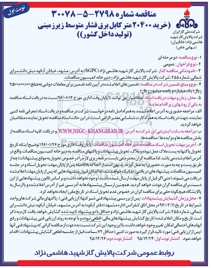 محل و زمان گشایش پیشنهادات: پس از بررسی پیشنهاد فنی شرکت ها ارزیابی فنی پاکتهای مالی شرکت های واجد شرایط در تاریخ 96.02.11 در محل اتاق کنفرانس اداره مشهد (دفتر آبکوه) به آدرس مشهد، خیابان آبکوه، نبش دانشسرای شمالی، شماره 255 شرکت پالایش گاز شهید هاشمی نژاد و حداقل با دو پیشنهاد تایید شده گشایش خواهد یافت لازم به ذکر است تا تاریخ و مکان اعلام شده تاریخ گشایش پیشنهادهای مالی قطعی نبوده و با توجه به روند ارزیابی فنی پیشنهادات و رفع ابهام های احتمالی امکان تغییر وجود خواهد داشت با این وجود این شرکت نسبت به دعوت از مناقصه گرانی که پیشنهاد فنی آنها پس از ارزیابی فنی مورد تایید قرار گیرد به صورت کتبی حداقل 72 ساعت قبل از جلسه قطعی گشایش پیشنهادات اقدام خواهد نمود