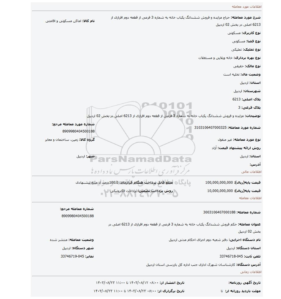 شرح مورد معامله: حراج مزایده و فروش ششدانگ یکباب خانه به شماره 3 فرعی از قطعه دوم افرازی از 6213 اصلی در بخش 02 اردبیل | نام کالا: اماکن مسکونی و اقامتی | |