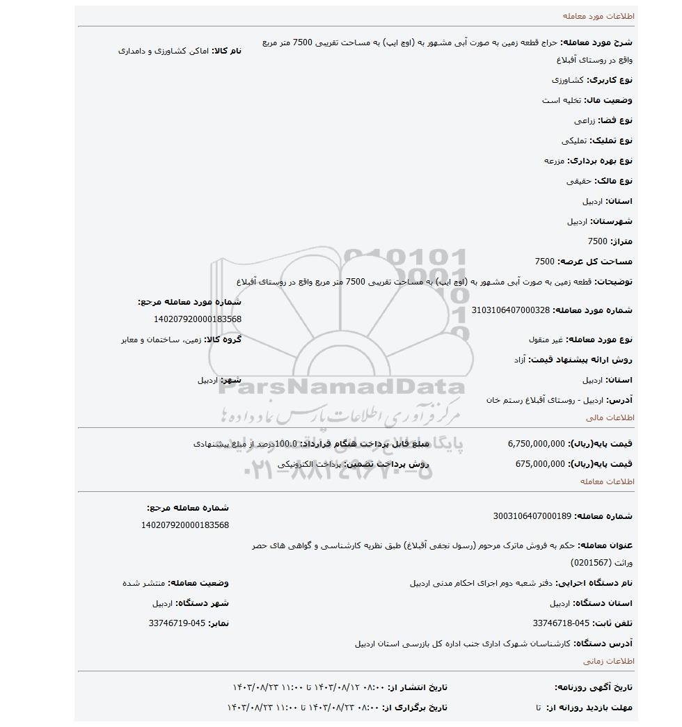شرح مورد معامله: حراج قطعه زمین به صورت آبی مشهور به (اوچ ایپ) به مساحت تقریبی 7500 متر مربع واقع در روستای آفبلاغ | نام کالا: اماکن کشاورزی و دامداری | |