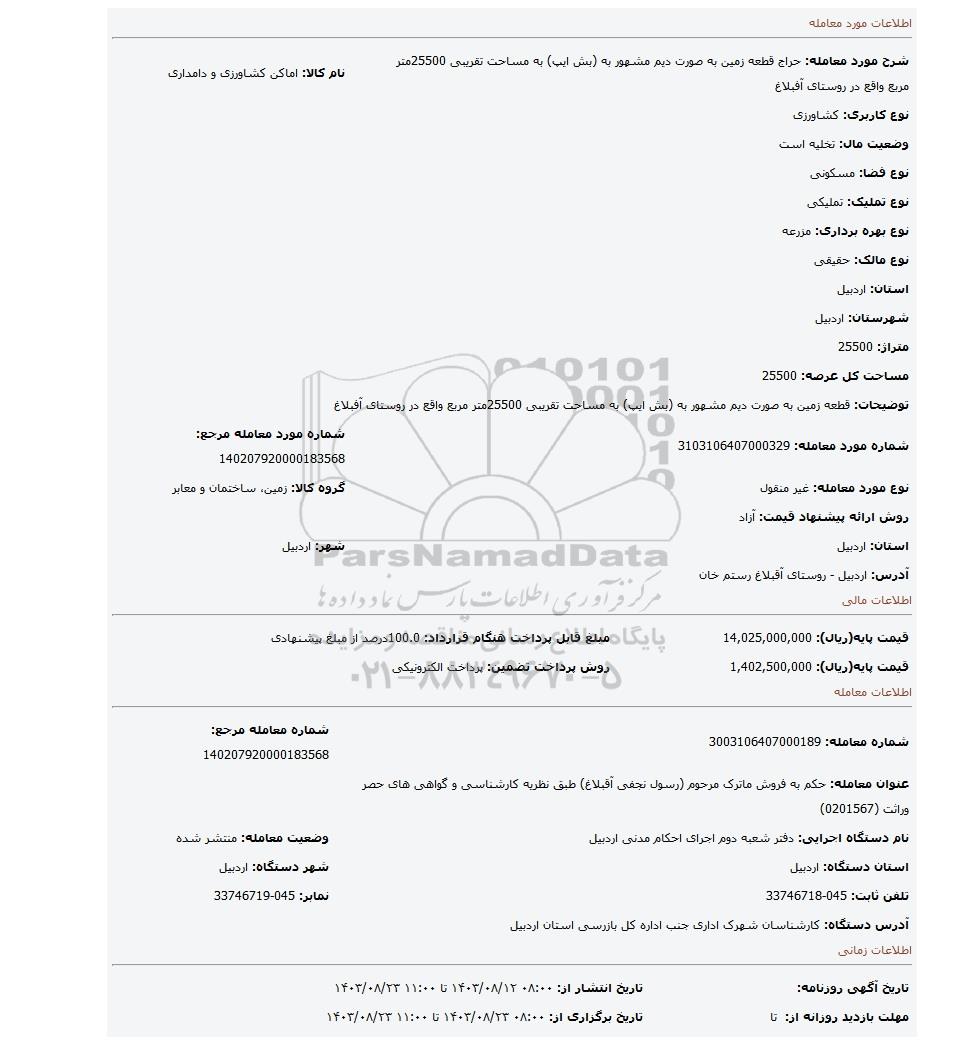 شرح مورد معامله: حراج قطعه زمین به صورت دیم مشهور به (بش ایپ) به مساحت تقریبی 25500متر مربع واقع در روستای آفبلاغ | نام کالا: اماکن کشاورزی و دامداری | |