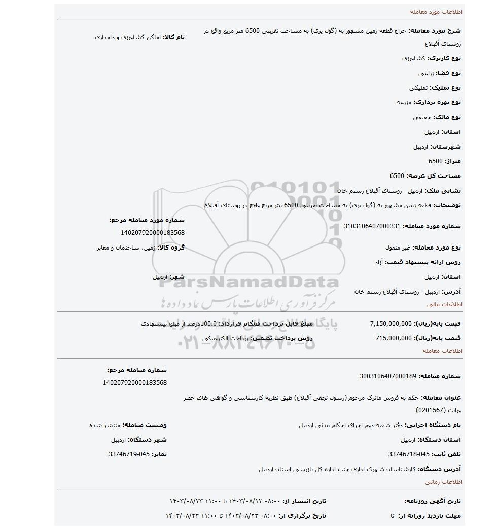 شرح مورد معامله: حراج قطعه زمین مشهور به (گول یری) به مساحت تقریبی 6500 متر مربع واقع در روستای آفبلاغ نام کالا: اماکن کشاورزی و دامداری
