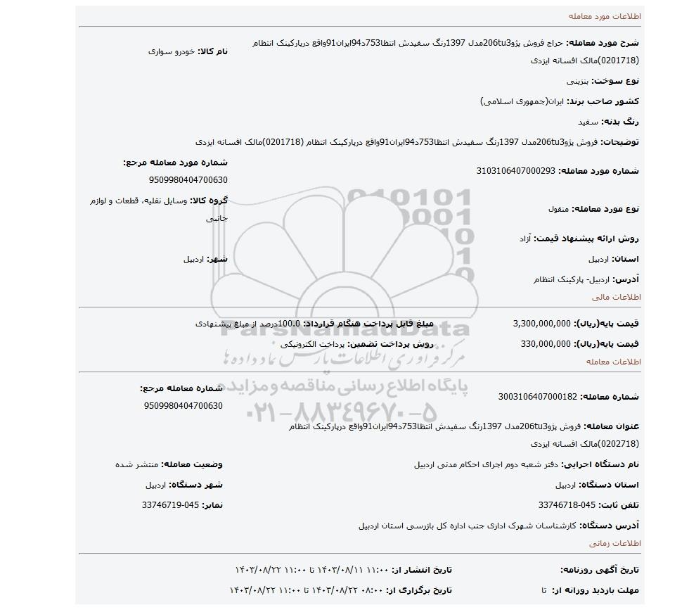 2 آگهی مزایده اموال منقول خودرو سوار 9635292 1404/07/10 new not special not payed خوزستان