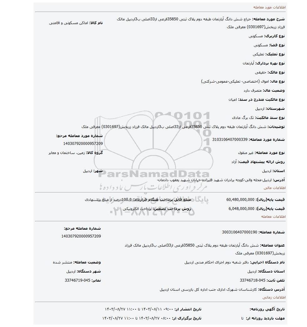 شرح مورد معامله: حراج شش دانگ آپارتمان طبقه دوم پلاک ثبتی 35850فرعی از33اصلی ب3اردبیل مالک فرزاد زربخش(0301697) معرفی ملکنام کالا: اماکن مسکونی و اقامتی