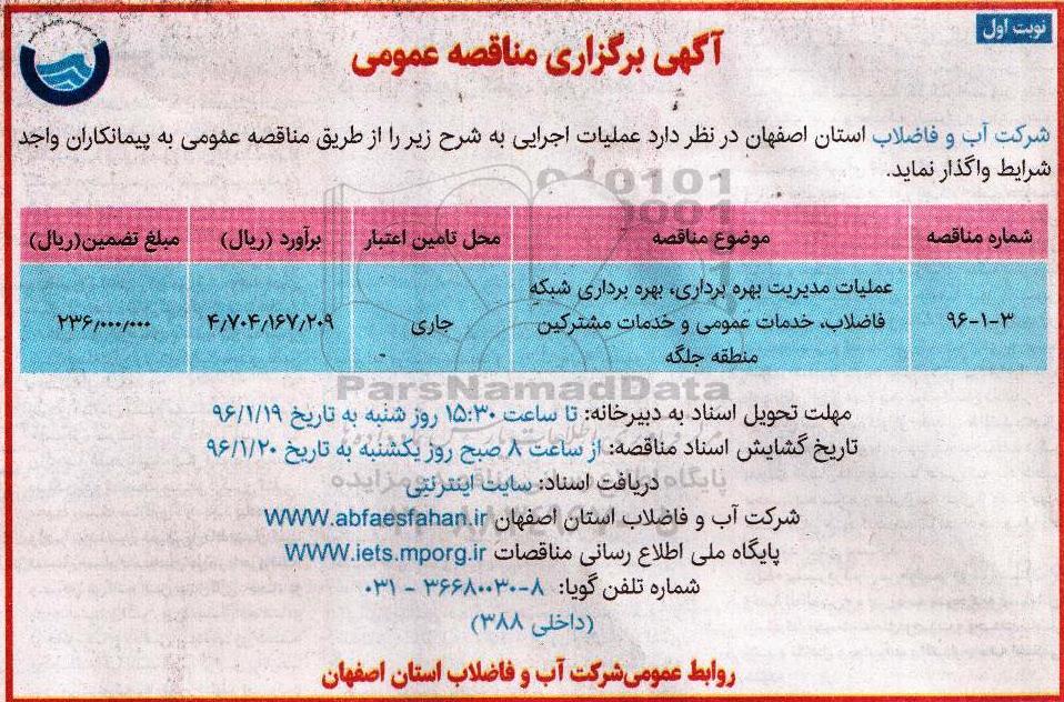 موضوع مناقصه : عملیات مدیریت بهره برداری ، بهره برداری شبکه فاضلاب ، خدمات عمومی و خدمات مشترکین منطقه جلگه