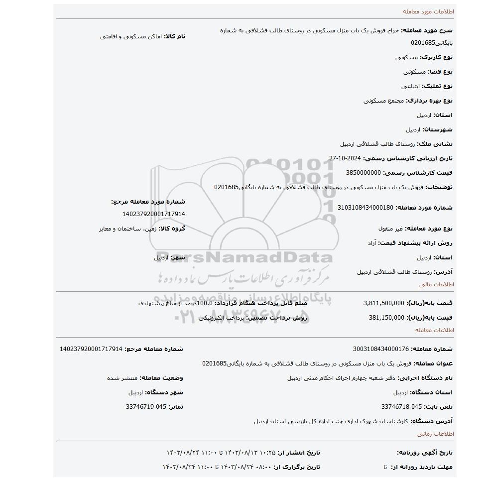 شرح مورد معامله: حراج فروش یک باب منزل مسکونی در روستای طالب قشلاقی به شماره بایگانی0201685 نام کالا: اماکن مسکونی و اقامتی