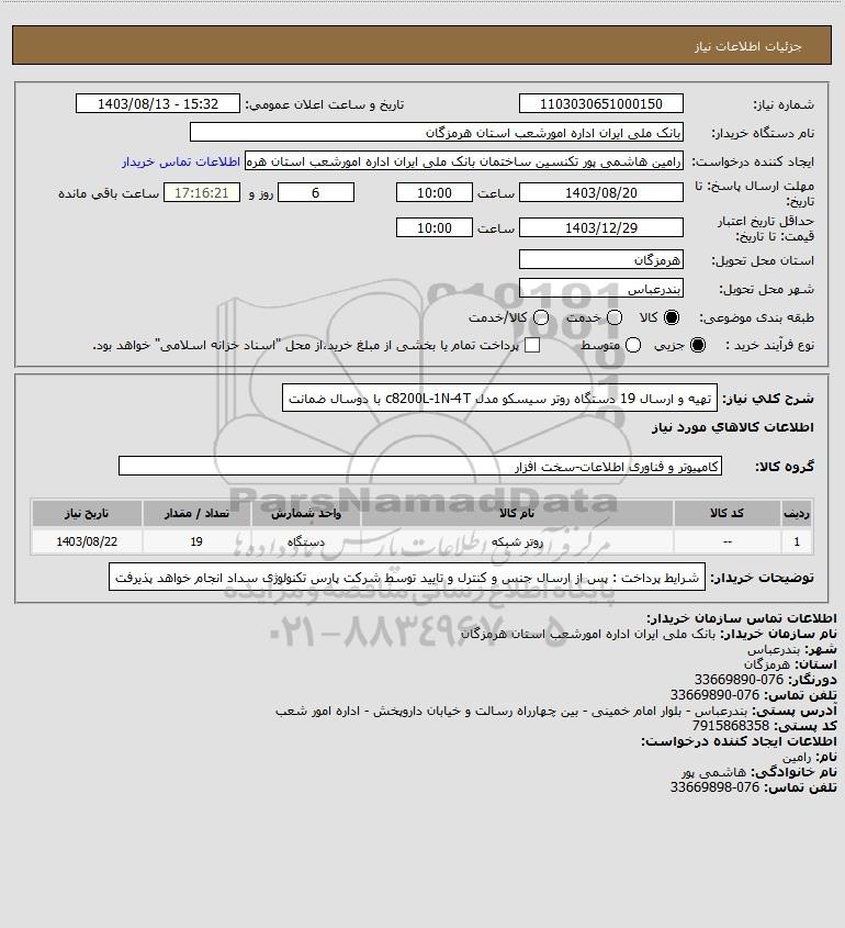 شرح کلی نیاز: تهیه و ارسال 19 دستگاه روتر سیسکو مدل c8200L-1N-4T با دوسال ضمانت