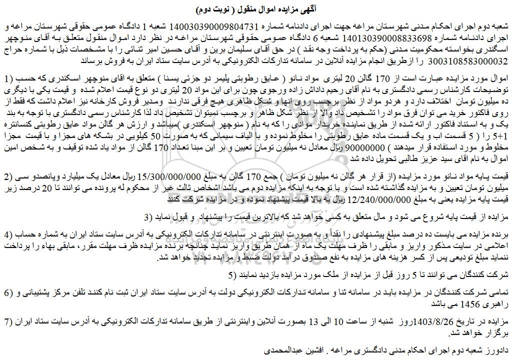 شعبه دوم اجرای احکام مدنی شهرستان مراغه جهت اجرای دادنامه شماره 140030390009804731 شعبه 1 دادگاه عمومی حقوقی شهرستان مراغه و اجرای دادنامه شماره 140130390008833698 شعبه 6 دادگاه عمومی حقوقی شهرستان مراغه در نظر دارد اموال منقول متعلق به آقای منوچهر اسگندری بخواسته محکومیت مدنی (حکم به پرداخت وجه نقد ) در حق آقای سلیمان برین و آقای حسین امیر ثنائی را با مشخصات ذیل با شماره حراج 3003108583000032 را ازطریق انجام مزایده آنلاین در سامانه تدارکات الکترونیکی به آدرس سایت ستاد ایران به فروش برساند