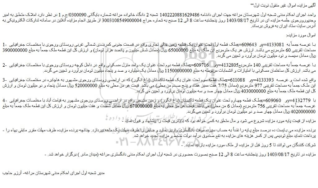 - مزایده در تاریخ 1403/08/17 روز پنجشنبه ساعت 8 الی 12 صبح بصورت حضوری در شعبه اول اجرای احکام مدنی دادگستری مراغه (میدان مادر ) برگزار خواهد شد.