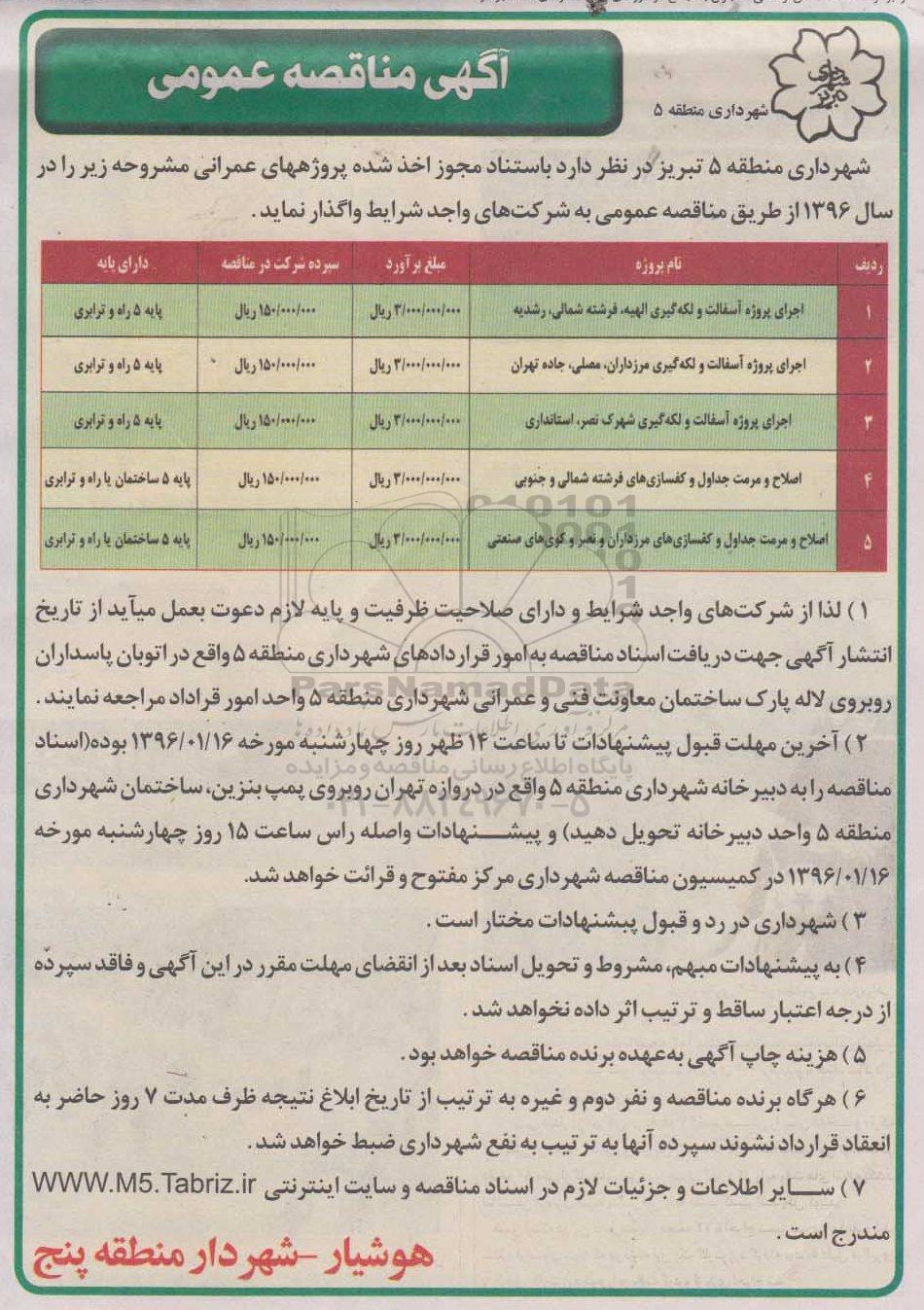 شهرداری منطقه 5 تبریز در نظر دارد با استناد مجوز اخذ شده پروژه های عمرانی مشروحه زیر را در سال 96 از طریق مناقصه عمومی به شرکت های واجد شرایط واگذار نماید.