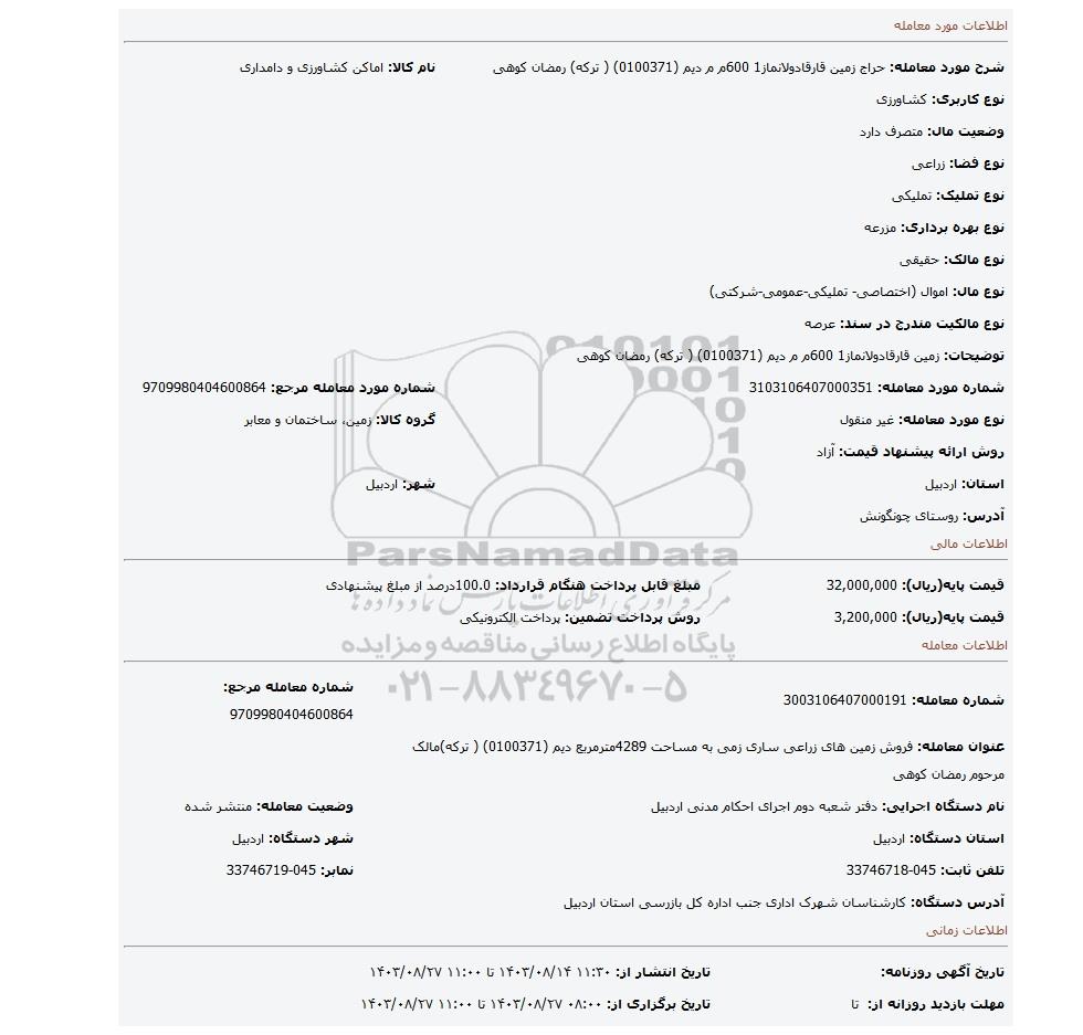 شرح مورد معامله: حراج زمین قارقادولانماز1 600م م دیم (0100371) ( ترکه) رمضان کوهی | نام کالا: اماکن کشاورزی و دامداری | |