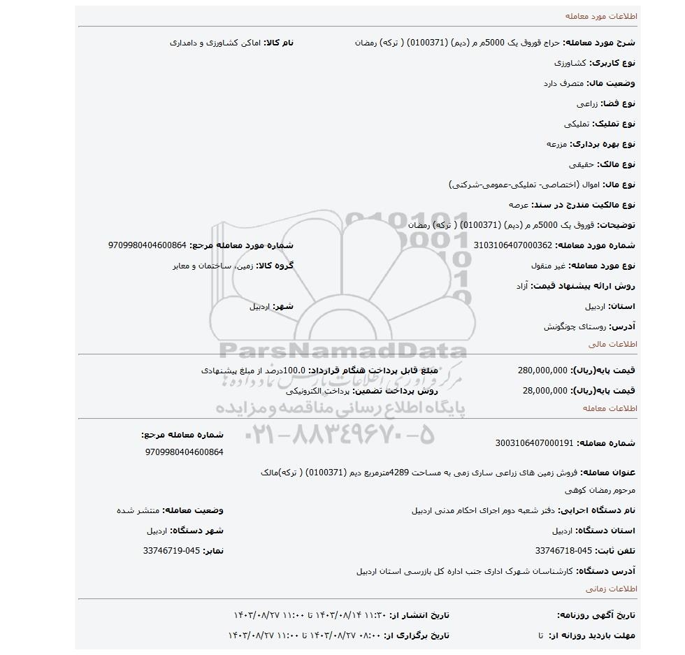 شماره مورد معامله: 3103106407000362 | شماره مورد معامله مرجع: 9709980404600864 | |