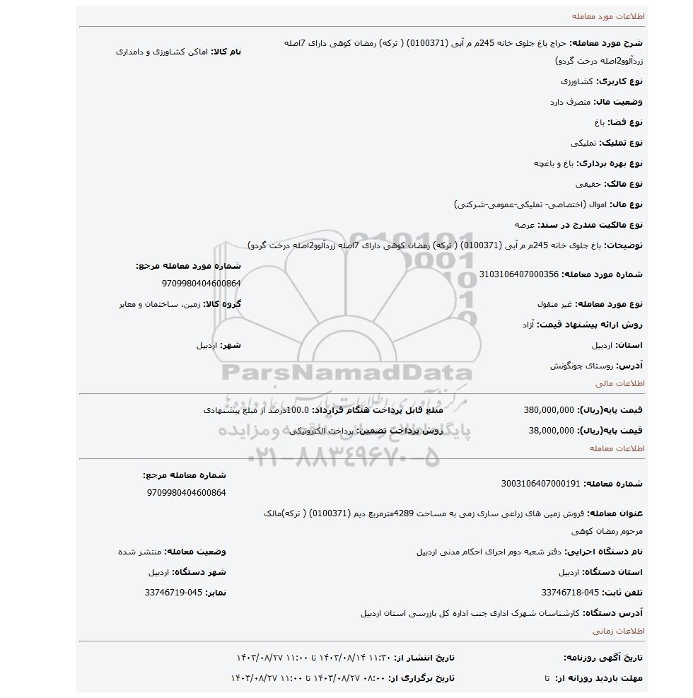 شرح مورد معامله: حراج باغ جلوی خانه 245م م آبی (0100371) ( ترکه) رمضان کوهی دارای 7اصله زردآلوو2اصله درخت گردو) | نام کالا: اماکن کشاورزی و دامداری | |