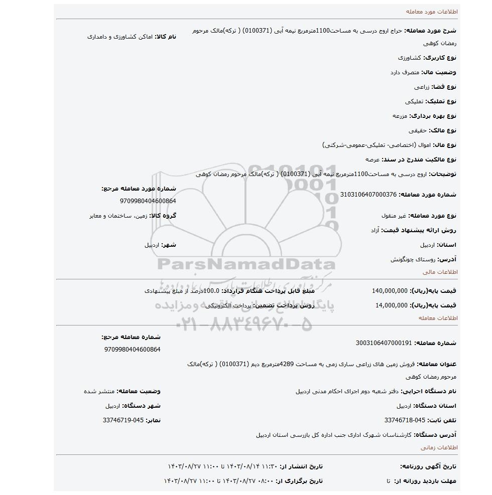 شرح مورد معامله: حراج اروج درسی به مساحت1100مترمربع نیمه آبی (0100371) ( ترکه)مالک مرحوم رمضان کوهی | نام کالا: اماکن کشاورزی و دامداری | |