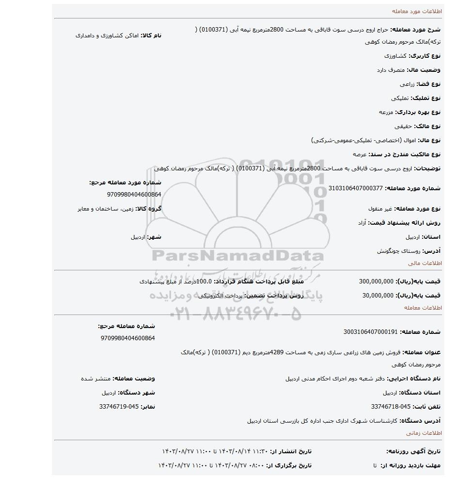 عنوان معامله: فروش زمین های زراعی ساری زمی به مساحت 4289مترمربع دیم (0100371) ( ترکه)مالک مرحوم رمضان کوهی | ||
