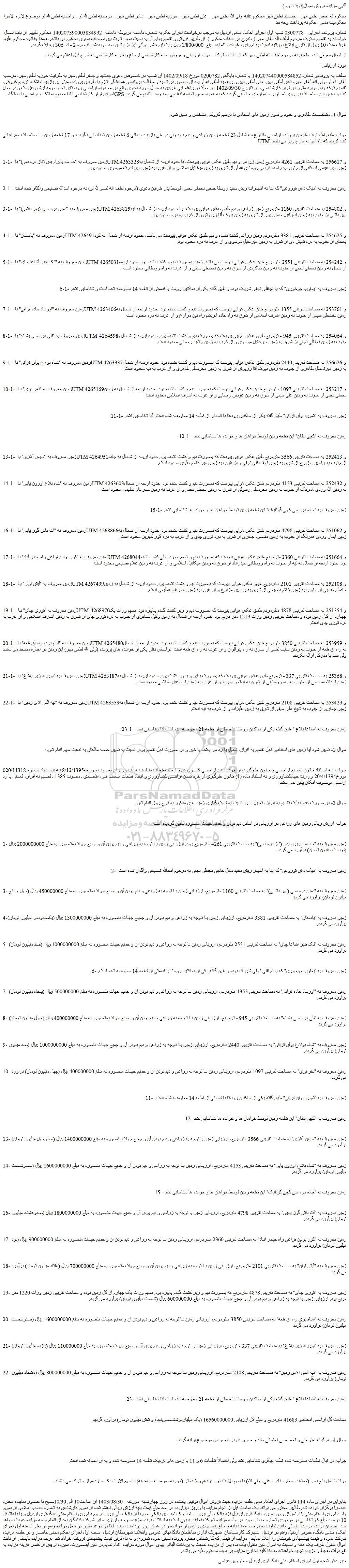 21-1- زمین معروف به "اورباد زیر بلاغ" با UTM 4263187و 25368 به مساحت تقریبی 337 مترمربع طبق عکس هوایی پیوست که بصورت بایر و بدون کشت بود. حدود اربعه از شمال به زمین اسدالله فصیحی از جنوب به راه روستایی از شرق به استخر اورباد و از غرب به زمین اسماعیل اسلامی محدود است.
