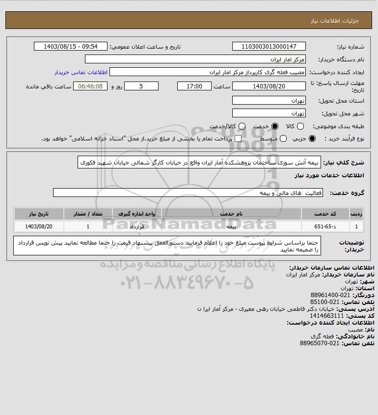 استعلام بیمه آتش سوزی ساختمان پزوهشکده آمار ایران واقع در خیابان کارگز شمالی خیابان شهید فکوری, استعلام بیمه آتش سوزی ساختمان پزوهشکده آمار ایران واقع در خیابان کارگز شمالی خیابان شهید فکوری