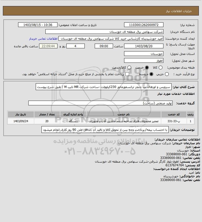 شرح کلی نیاز: سرویس و اورهال تپ چنجر ترانسفورماتور 230کیلوولت -ساخت شرکت MR تایپ M / طبق شرح پیوست