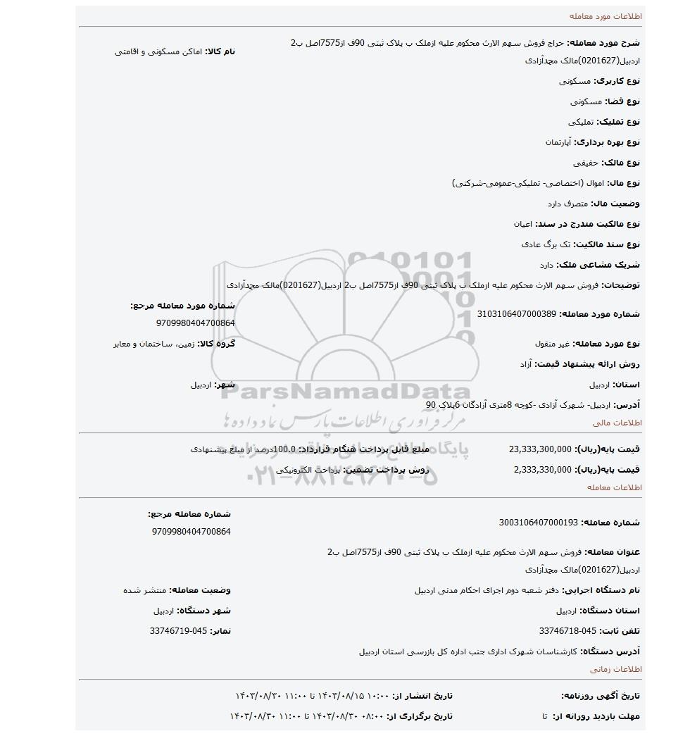 عنوان معامله: فروش سهم الارث محکوم علیه ازملک ب پلاک ثبتی 90ف از7575اصل ب2 اردبیل(0201627)مالک محمدآزادی