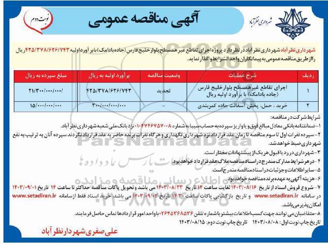 شهرداری نظرآباد در نظر دارد پروژه اجرای تقاطع غیر همسطح بلوار خلیج فارس (جاده بادامک ) با برآورد اولیه 425.378.626.743 ریال را از طریقق مناخقصه عمومی به پیمانکاران واجد الشرایط واگذار نماید