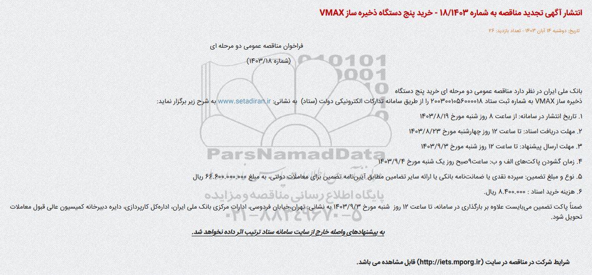 بانک ملی ایران در نظر دارد مناقصه عمومی دو مرحله ای خرید پنج دستگاه ذخیره ساز VMAX به شماره ثبت ستاد 2003001056000018 را از طریق سامانه تدارکات الکترونیکی دولت (ستاد) به نشانی: ستادایران به شرح زیر برگزار نماید:
