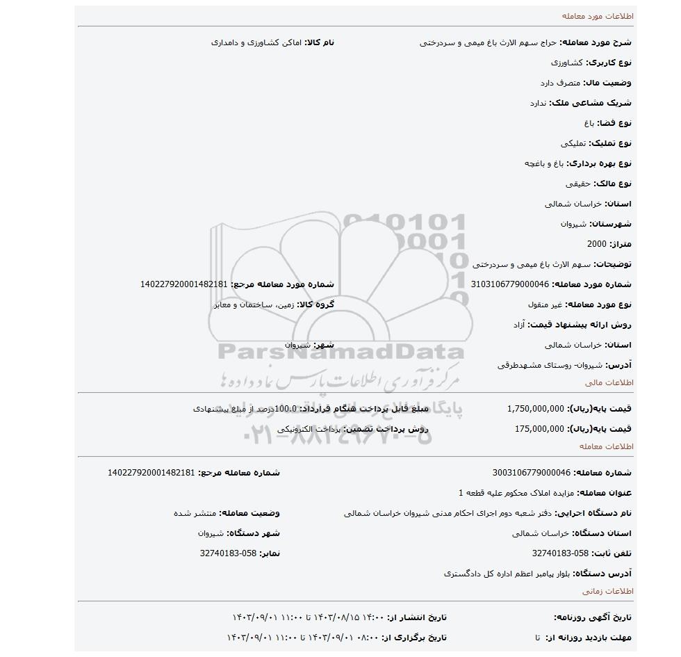 | شرح مورد معامله: حراج سهم الارث باغ میمی و سردرختی | نام کالا: اماکن کشاورزی و دامداری | |