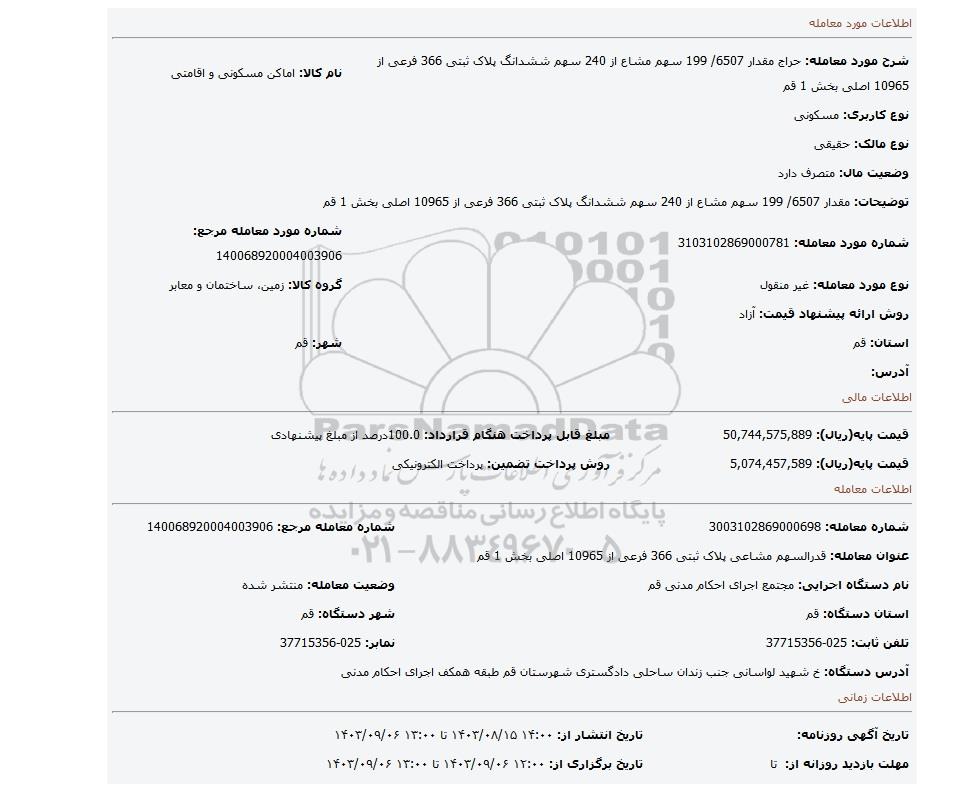 شرح مورد معامله: حراج مقدار 6507/ 199 سهم مشاع از 240 سهم ششدانگ پلاک ثبتی 366 فرعی از 10965 اصلی بخش 1 قم نام کالا: اماکن مسکونی و اقامتی