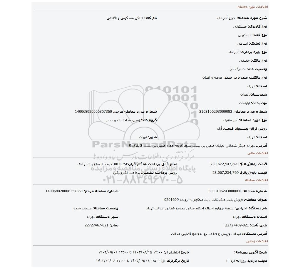 نام دستگاه اجرایی: شعبه چهارم اجرای احکام مدنی مجتمع قضایی عدالت تهرانوضعیت معامله: منتشر شده