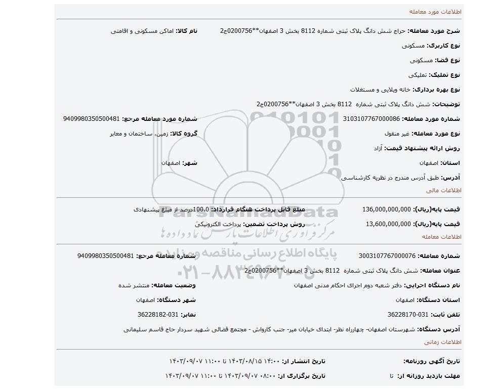| شرح مورد معامله: حراج شش دانگ پلاک ثبتی شماره 8112 بخش 3 اصفهان**0200756ج2 | نام کالا: اماکن مسکونی و اقامتی | |