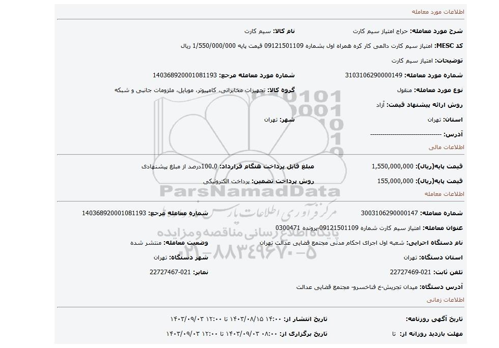 عنوان معامله: امتیاز سیم کارت شماره 09121501109-پرونده 0300471