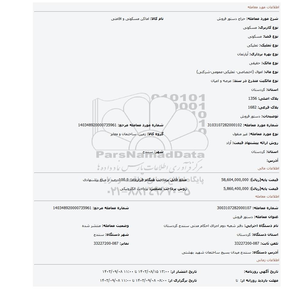 شرح مورد معامله: حراج دستور فروشنام کالا: اماکن مسکونی و اقامتی
