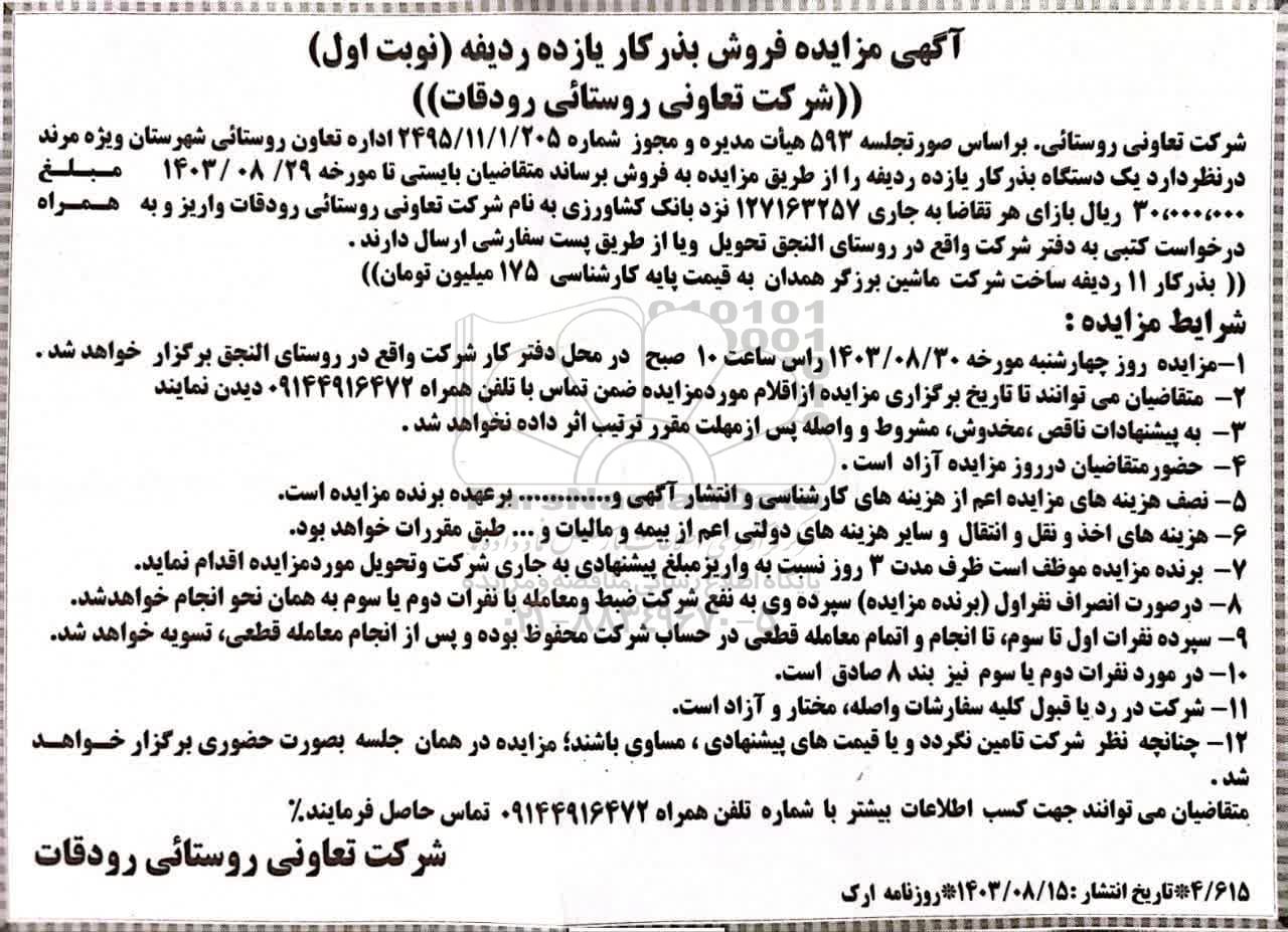 آگهی مزایده فروش بذرکار یازده ردیفه نوبت اول ((شرکت تعاونی روستائی رودقات))