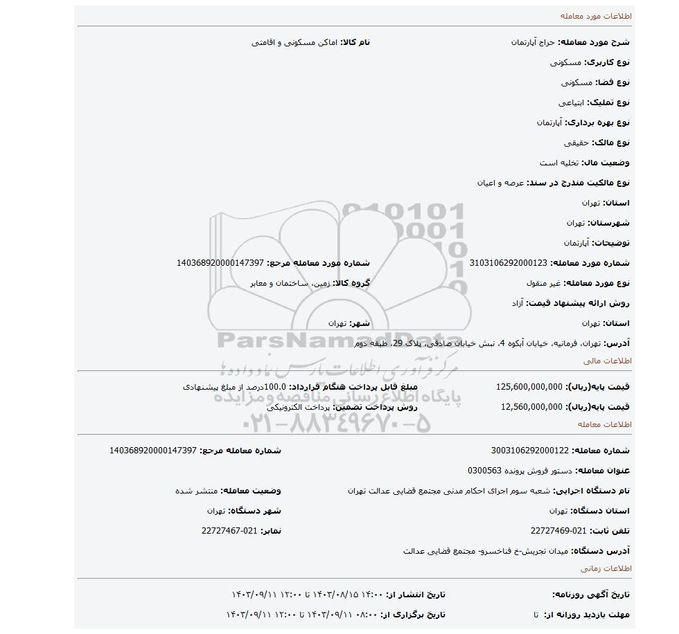 شرح مورد معامله: حراج آپارتماننام کالا: اماکن مسکونی و اقامتی