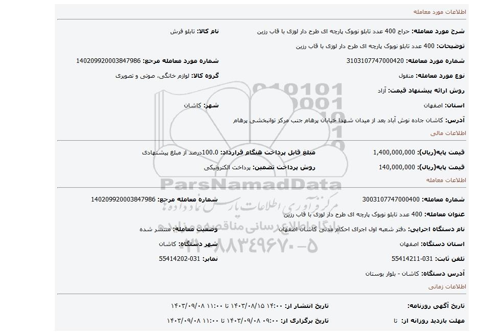 | شماره مورد معامله: 3103107747000420 | شماره مورد معامله مرجع: 140209920003847986 | |