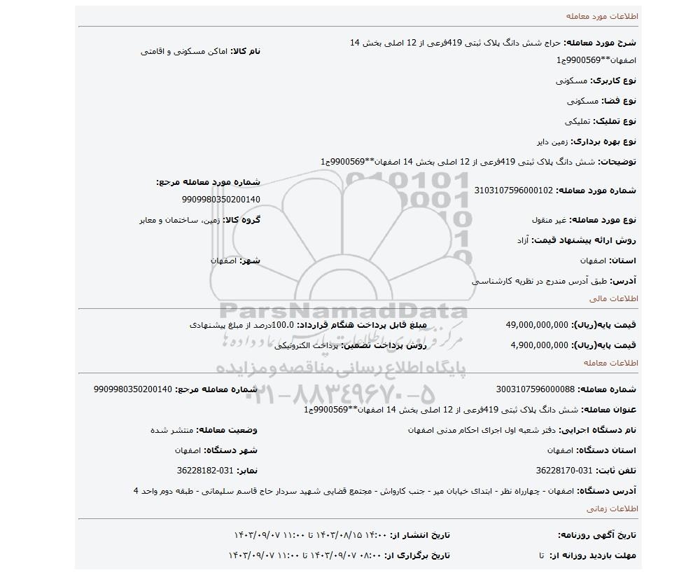 شرح مورد معامله: حراج شش دانگ پلاک ثبتی 419فرعی از 12 اصلی بخش 14 اصفهان**9900569ج1نام کالا: اماکن مسکونی و اقامتی