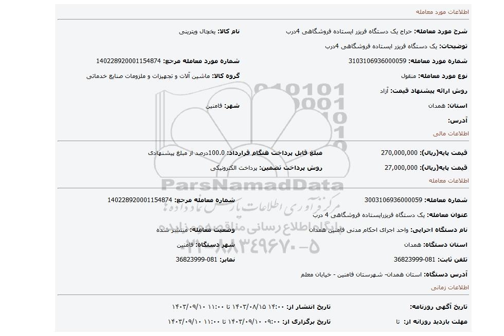 نام دستگاه اجرایی: واحد اجرای احکام مدنی فامنین همدانوضعیت معامله: منتشر شده