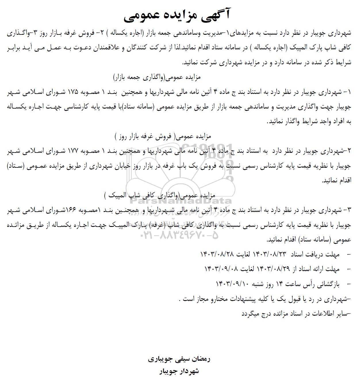 1- شهرداری جویبار در نظر دارد به استناد بند ج ماده 4 آئین نامه مالی شهرداریها و همچنین بند 1 مصوبه 175 شورای اسلامی شهر جویبار جهت واگذاری مدیریت و ساماندهی جمعه بازار از طریق مزایده عمومی سامانه ستاد با قیمت پایه کارشناسی جهت اجاره یکساله به افراد واجد شرایط واگذار نمائید.