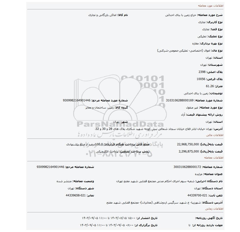 شماره مورد معامله: 3103106288000169شماره مورد معامله مرجع: 9309982164901446