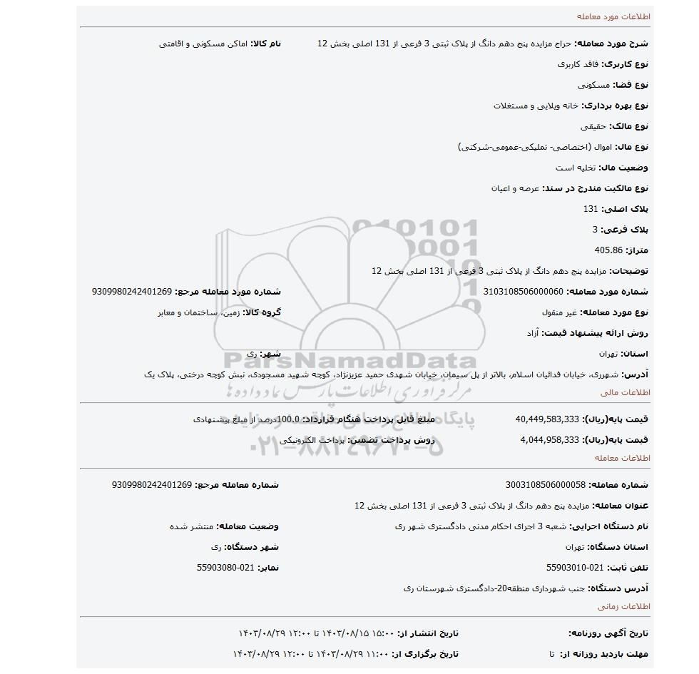 | شرح مورد معامله: حراج مزایده پنج دهم دانگ از پلاک ثبتی 3 فرعی از 131 اصلی بخش 12 | نام کالا: اماکن مسکونی و اقامتی | |