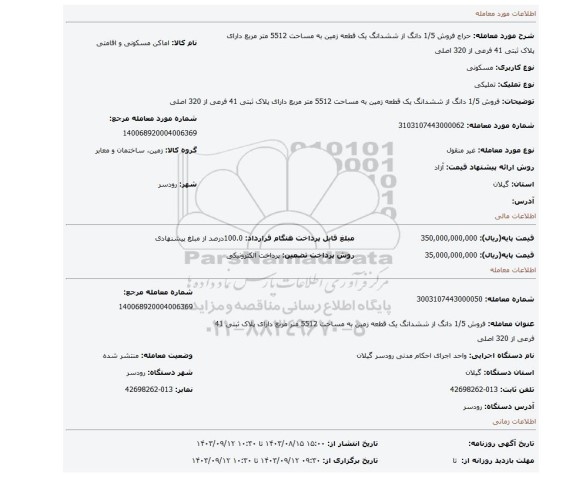 | شرح مورد معامله: حراج فروش 1/5 دانگ از ششدانگ یک قطعه زمین به مساحت 5512 متر مربع دارای پلاک ثبتی 41 فرعی از 320 اصلی | نام کالا: اماکن مسکونی و اقامتی | |