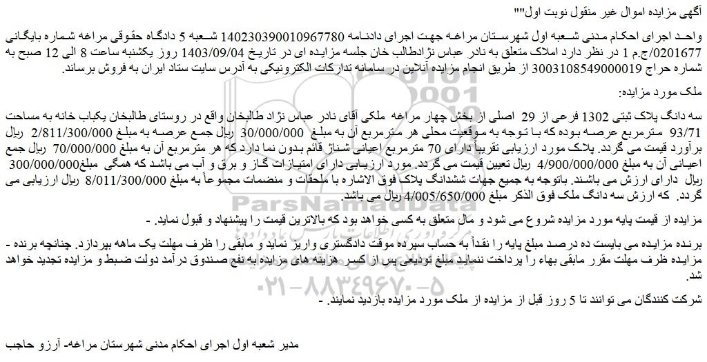 واحد اجرای احکام مدنی شعبه اول شهرستان مراغه جهت اجرای دادنامه 140230390010967780 شعبه 5 دادگاه حقوقی مراغه شماره بایگانی 0201677/ج.م 1 در نظر دارد املاک متعلق به نادر عباس نژادطالب خان جلسه مزایده ای در تاریخ 1403/09/04 روز یکشنبه ساعت 8 الی 12 صبح به شماره حراج 3003108549000019 از طریق انجام مزایده آنلاین در سامانه تدارکات الکترونیکی به آدرس سایت ستاد ایران به فروش برساند.