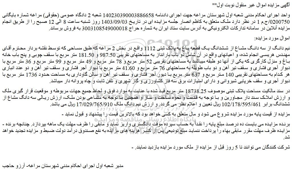 نیم دانگ از سه دانگ مشاع از ششدانگ یک قطعه باغ به پلاک ثبتی 1112 واقع در بخش 2 مراغه که طبق مساحی که توسط نقشه بردار محترم آقای مهندس هریسی انجام شده، و اعیانهای واقع در آن شامل دو باب بارانداز به مساحتهای تقریبی 987.50 و 181.50 متر مربع با سقف چوبی و پنج باب خانه باغ و منزل کارگری که یکی از آنها دو طبقه میباشد به مساحتهای تقریبی 52 متر مربع و 78 متر مربع و 49 متر مربع و 99 متر مربع و 36 متر مربع با دیوار آجری فشاری و سقف تیر آهن و دو باب طویله به مساحتهای 76 متر مربع و 41.60 متر مربع با دیوار آجر فشاری و سقف تیر آهن و دو عدد انباری هر کدام به مساحتهای تقریبی 140 متر مربع و 637 متر مربع با دیور آجر فشاری و سقف تیر آهن و سالن گاوداری به مساحت حدود 1736 متر مربع با دیوار آجری و سقف خرپایی شیروانی و دارای امتیازات برق سه فاز کشاورزی و گاز شهری و تلفن ثابت و چاه پروانه دار میباشد.