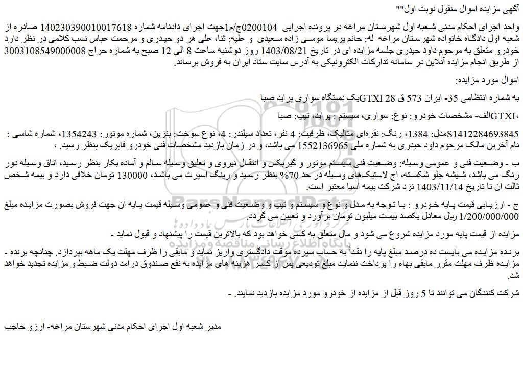 واحد اجرای احکام مدنی شعبه اول شهرستان مراغه در پرونده اجرایی 0200104ج/م1جهت اجرای دادنامه شماره 140230390010017618 صادره از شعبه اول دادگاه خانواده شهرستان مراغه له: حانم پریسا موسی زاده سعیدی و علیه: ثنا، علی هر دو حیدری و مرحمت عباس نسب کلامی در نظر دارد خودرو متعلق به مرحوم داود حیدری جلسه مزایده ای در تاریخ 1403/08/21 روز دوشنبه ساعت 8 الی 12 صبح به شماره حراج 3003108549000008 از طریق انجام مزایده آنلاین در سامانه تدارکات الکترونیکی به آدرس سایت ستاد ایران به فروش برساند.