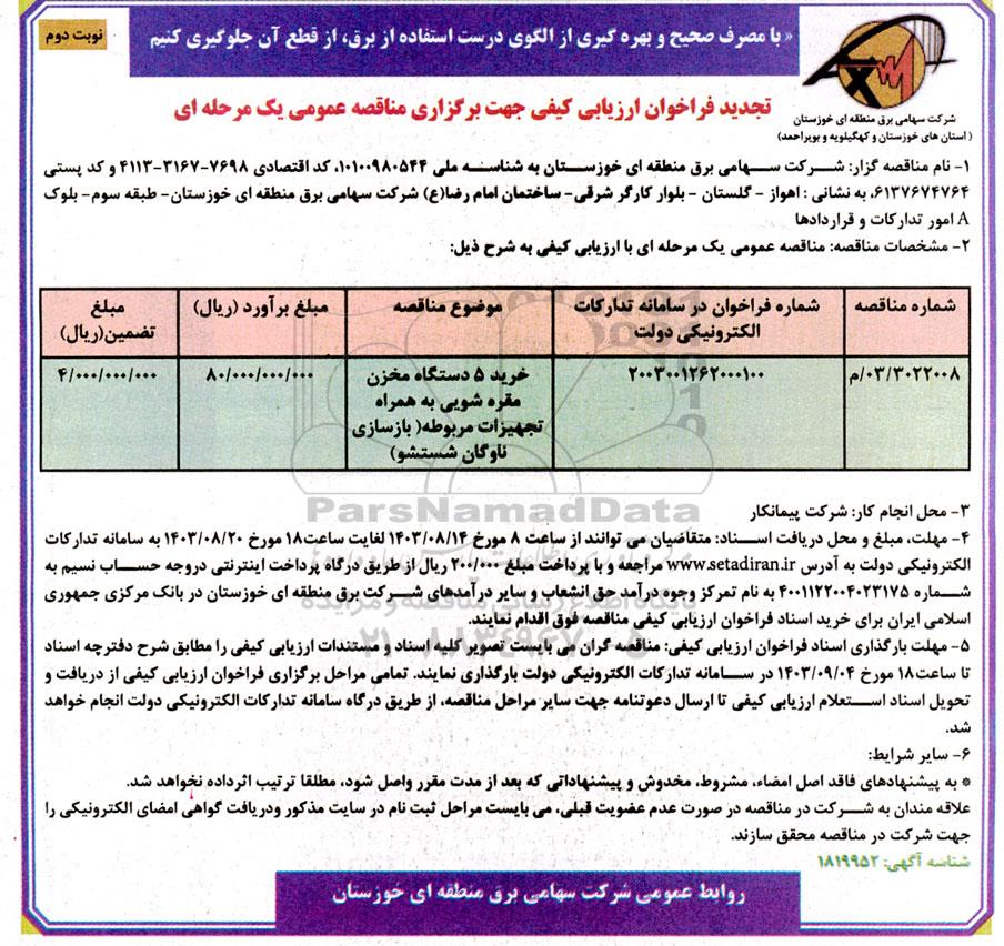 3022008/ 03/م | 2003001262000100 | خرید 5 دستگاه مخزن مقره شویی به همراه تجهیزات مربوطه (بازسازی ناوگان شستشو) | 80.000.000.000 | 4.000.000.000 |