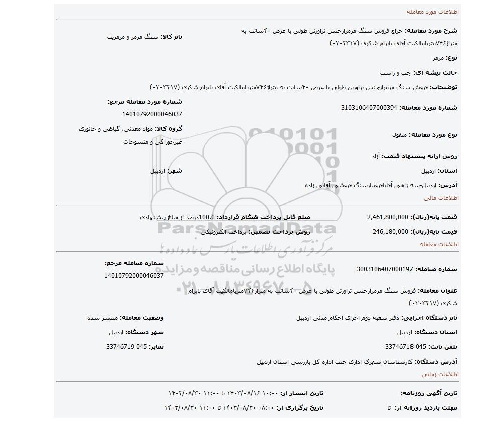 عنوان معامله: فروش سنگ مرمرازجنس تراورتن طولی با عرض ۴۰سانت به متراژ۷۴۶متربامالکیت آقای بایرام شکری (۰۲۰۳۳۱۷) | ||