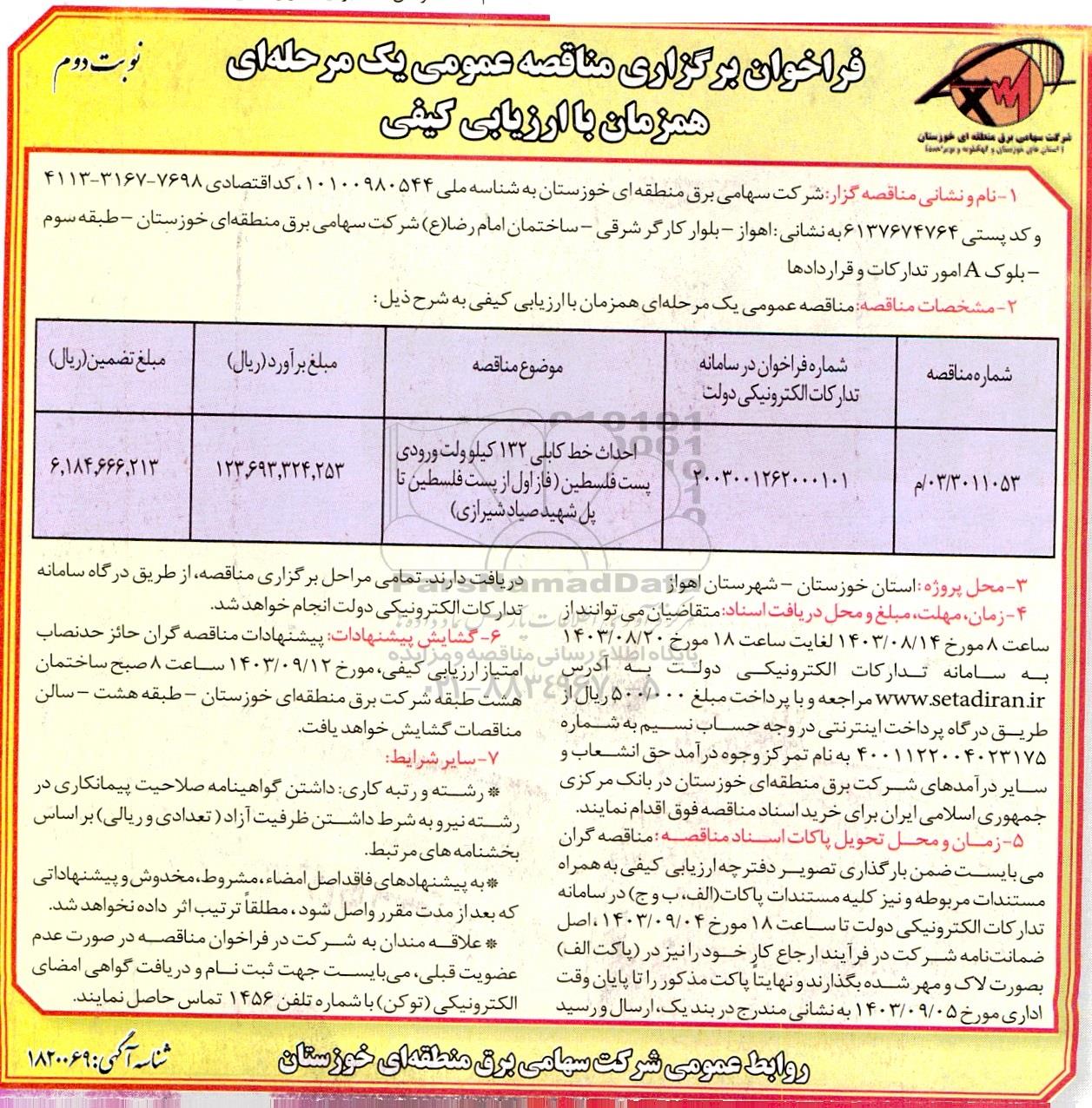 03/3011053/م | 2003001262000101 | احداث خط کابلی 132 کیلوولت ورودی پست فلسطین (فاز اول از پست فلسطین تا پل شهید صیاد شیرازی) | 123.693.324.253 | 6.184.666.213 |