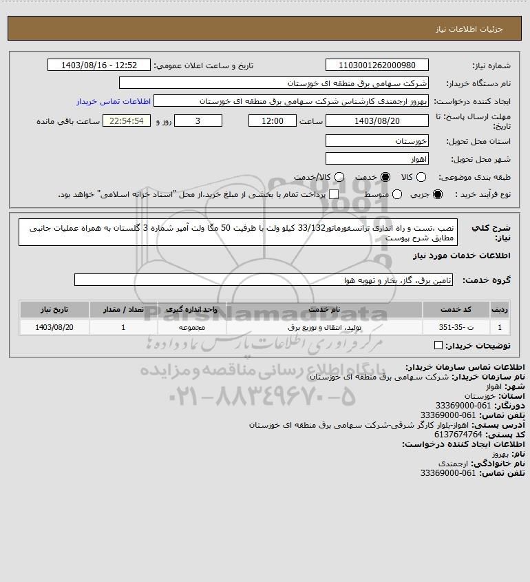 شرح کلی نیاز: نصب ،تست و راه اندازی ترانسفورماتور33/132 کیلو ولت با ظرفیت 50 مگا ولت آمپر شماره 3 گلستان به همراه عملیات جانبی مطابق شرح پیوست