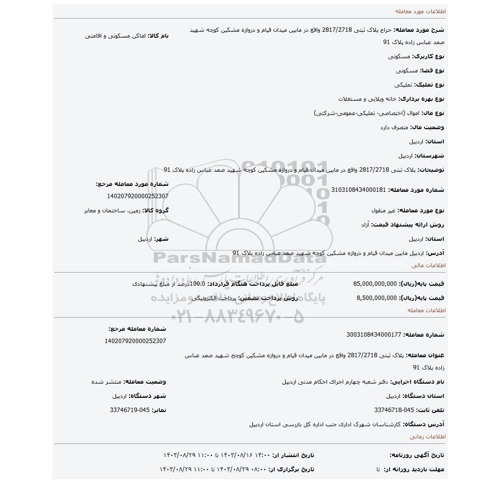 شرح مورد معامله: حراج پلاک ثبتی 2817/2718 واقع در مابین میدان قیام و دروازه مشکین کوچه شهید صمد عباس زاده پلاک 91 نام کالا: اماکن مسکونی و اقامتی