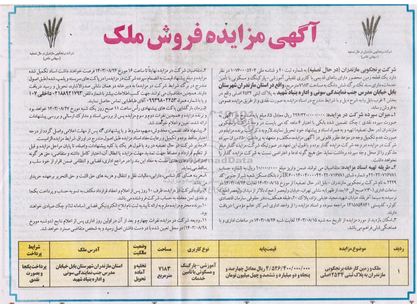 مزایده فروش یک قطعه زمین محصور دارای بناهای قدیمی با کاربری تلفیقی آموزشی - پارکینگ و مسکونی باتامین خدمات دارای سند تک برگ به مساحت 7183 مترمربع واقع در مازندران شهرستان بابل خیابان مدرس جنب نمایندگی سونی