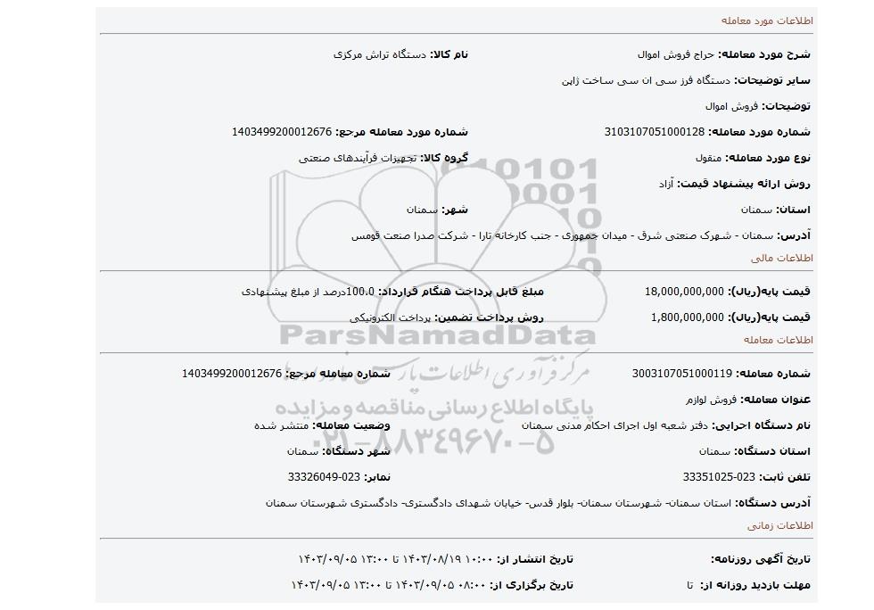 شرح مورد معامله: حراج فروش اموالنام کالا: دستگاه تراش مرکزی