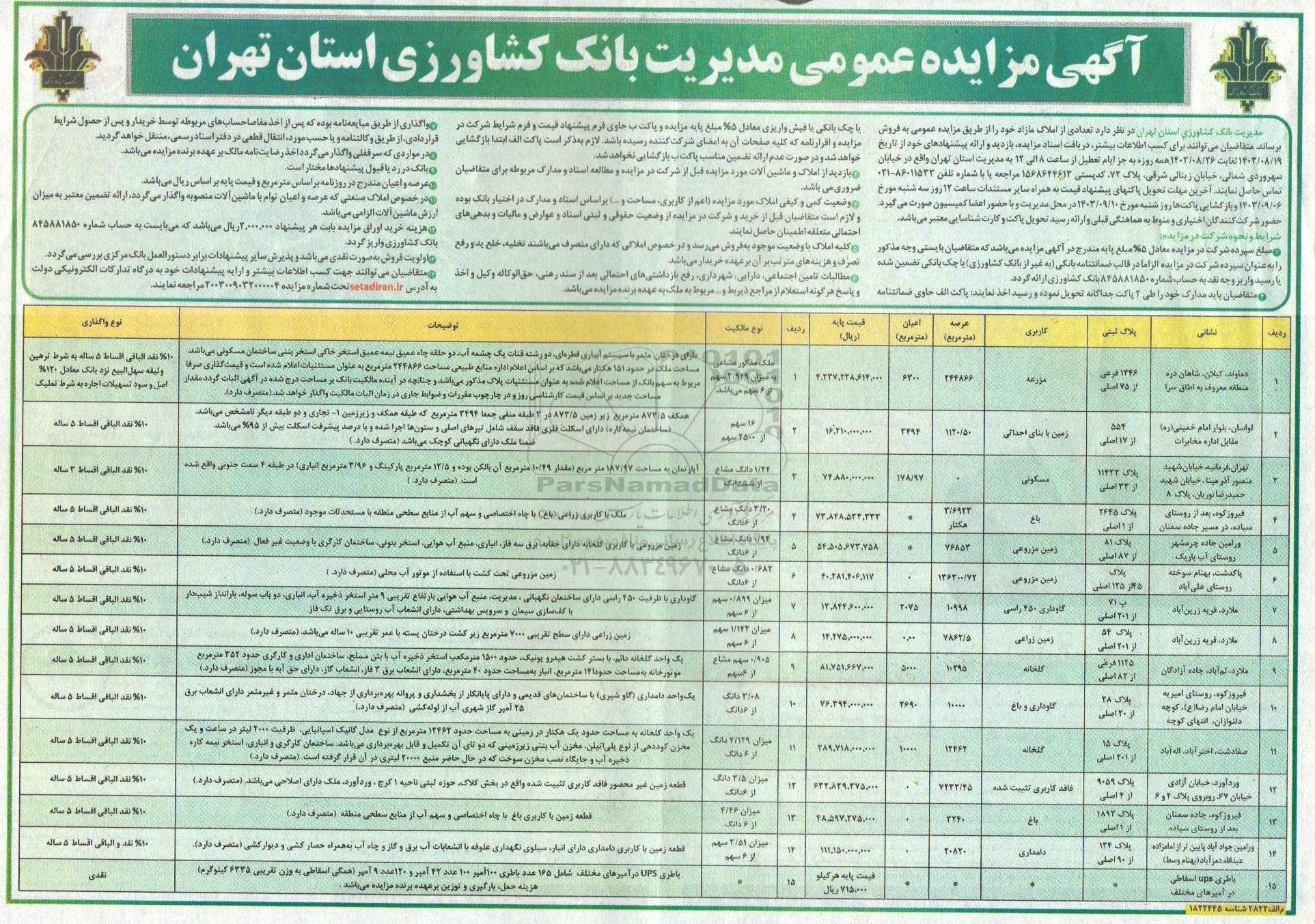 مزایده فروش املاک مازاد با کاربری مزرعه و مسکونی و باغ و گلخانه